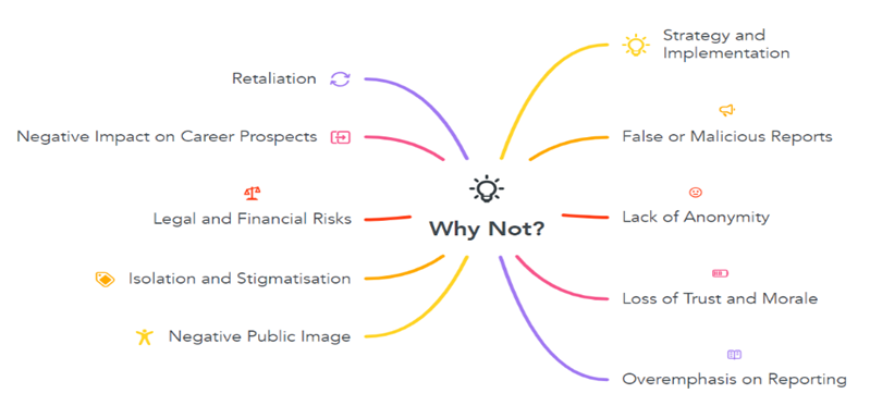 The existence of a whistleblowing policy can lead to a breakdown of trust between managers and employees, which can create tension and affect effective working relationships among employees. It can also sometimes undermine the trust and morale of employees within an organisation. They might feel that management is not addressing issues proactively and that internal matters are being exposed externally.